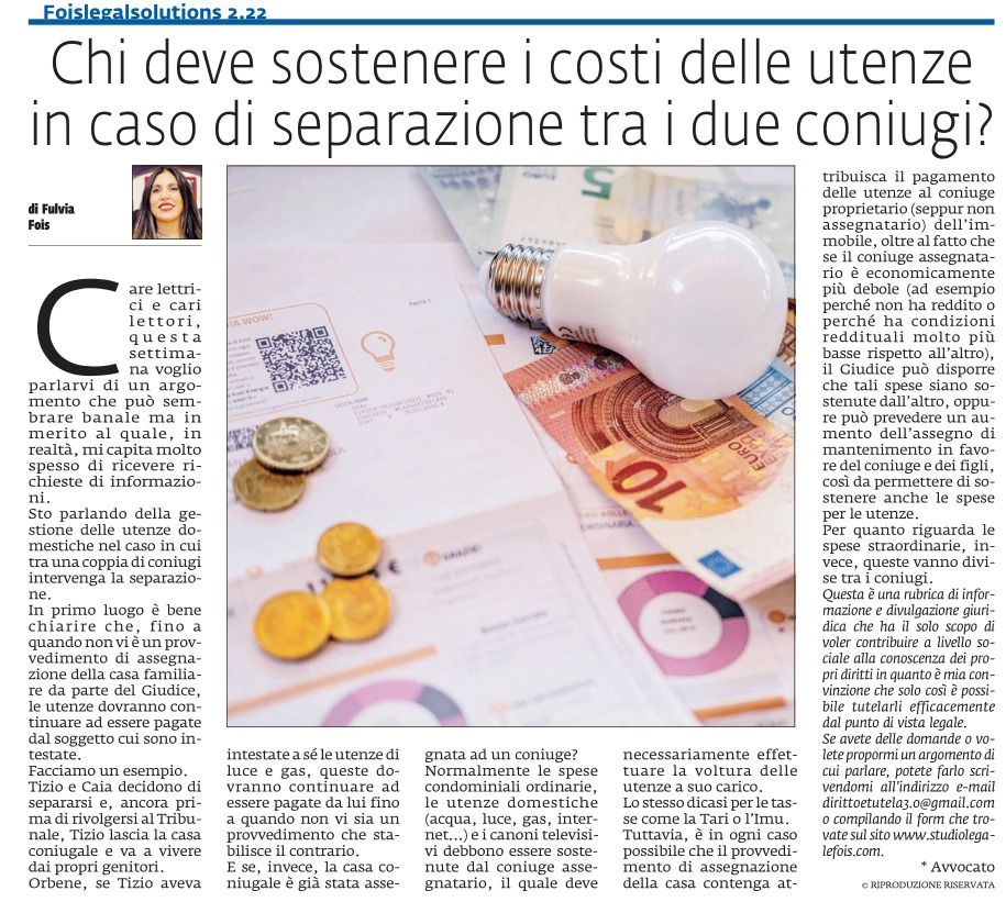 Chi deve sostenere i costi delle utenze in caso di separazione tra i due coniugi?